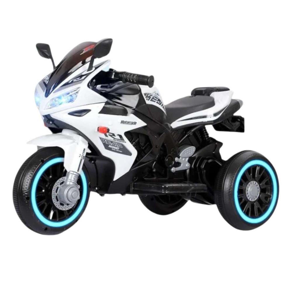 دراجة أطفال كهربائية بثلاث عجلات بتصميم رياضي جذاب مستوحى من دراجات السباق. تأتي بلون أزرق أنيق مع تفاصيل باللون الأسود والأبيض، ومزوّدة بأضواء أمامية، ومريحة للقيادة.