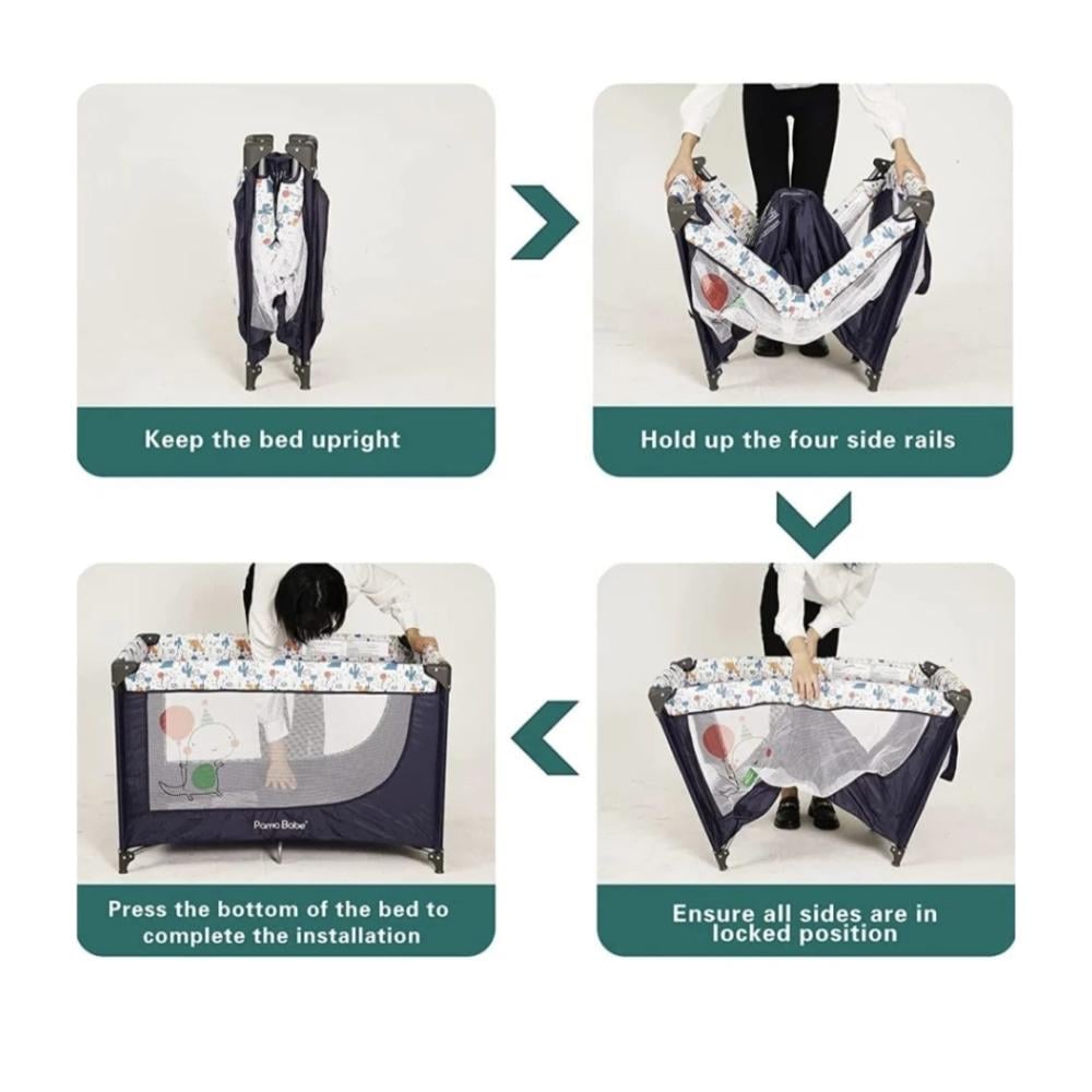 يمكن إزالة سرير السرير بسهولة وجعله ملعب الأطفال. او ملعب سفر الأطفال صغير الحجم ولا يشغل مساحة كبيرة. حقيبة الحمل مريحة للتخزين والنقل، يناسب سرير الاطفال هذا السفر ويمكن وضعه في صندوق السيارة فهو مثالي للسفر.